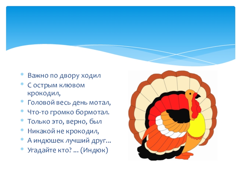 Важно по двору ходилС острым клювом крокодил,Головой весь день мотал,Что-то громко бормотал.Только это, верно, былНикакой не крокодил,А