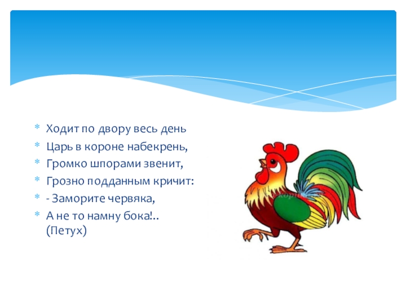 Ходит по двору весь деньЦарь в короне набекрень,Громко шпорами звенит,Грозно подданным кричит:- Заморите червяка,А не то намну бока!.. (Петух)