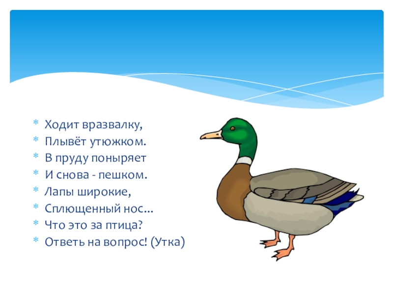 Ходит вразвалку,Плывёт утюжком.В пруду поныряетИ снова - пешком.Лапы широкие,Сплющенный нос...Что это за птица?Ответь на вопрос! (Утка)