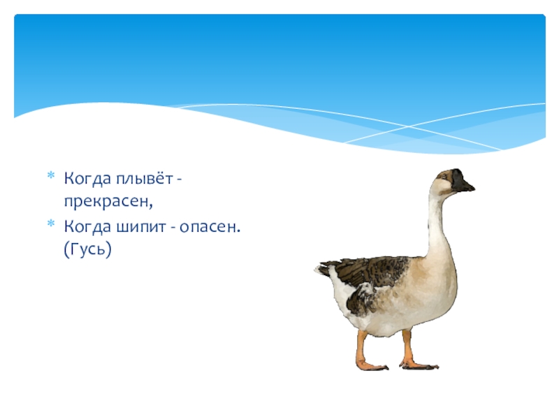 Когда плывёт - прекрасен,Когда шипит - опасен. (Гусь)