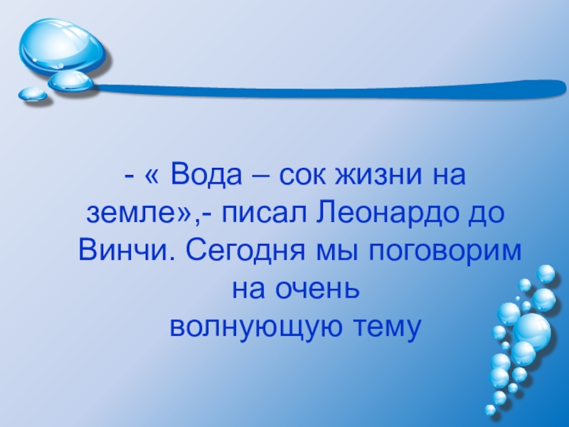 Слайд 5- « Вода – сок жизни на земле»,- писал Леонардо до