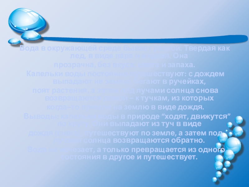 Выводы: капельки воды в природе “ходят, движутся” по кругу. Они выпадают из туч в виде