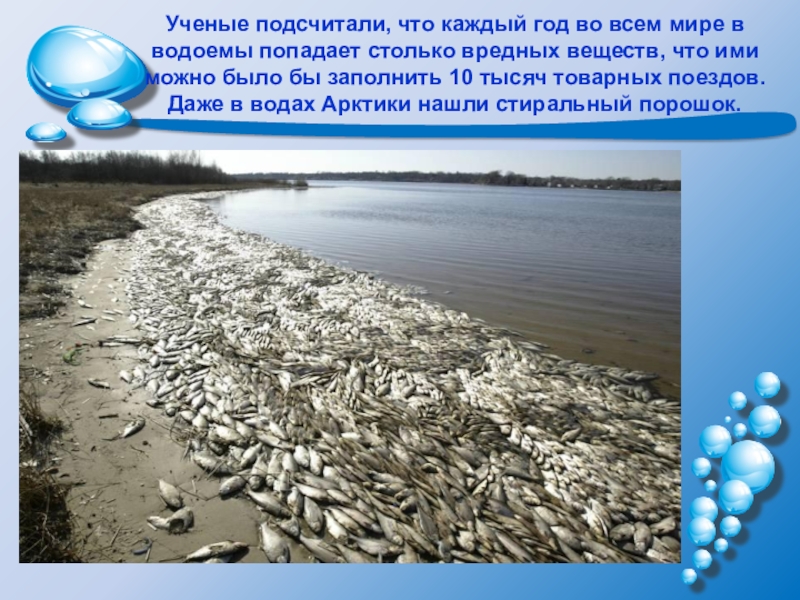 Слайд 23Ученые подсчитали, что каждый год во всем мире в водоемы попадает
