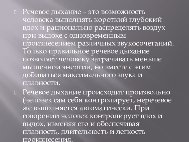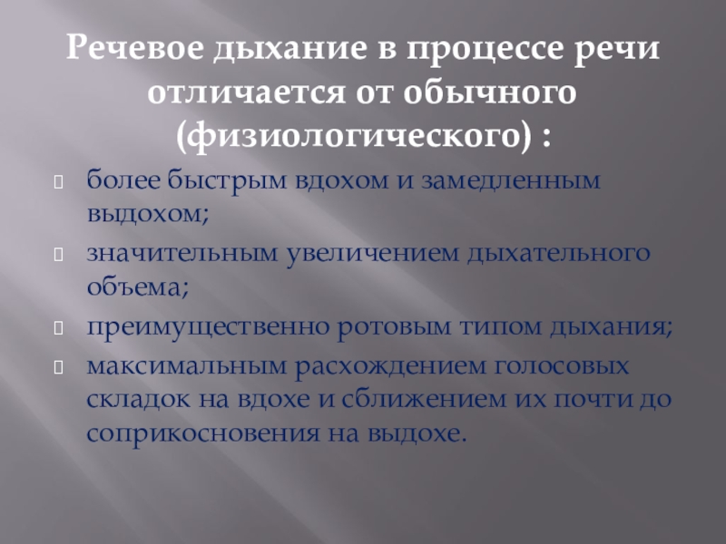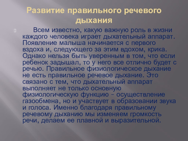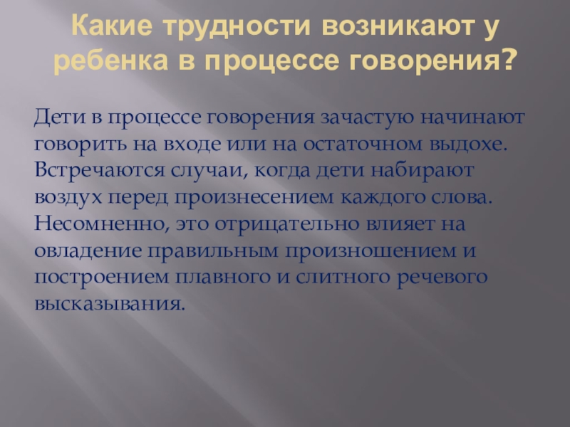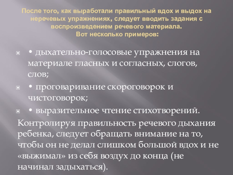 Контролируя правильность речевого дыхания ребенка, следует обращать внимание на то, чтобы он не делал слишком большой вдох и не «выжимал» из себя воздух до конца (не начинал задыхаться).