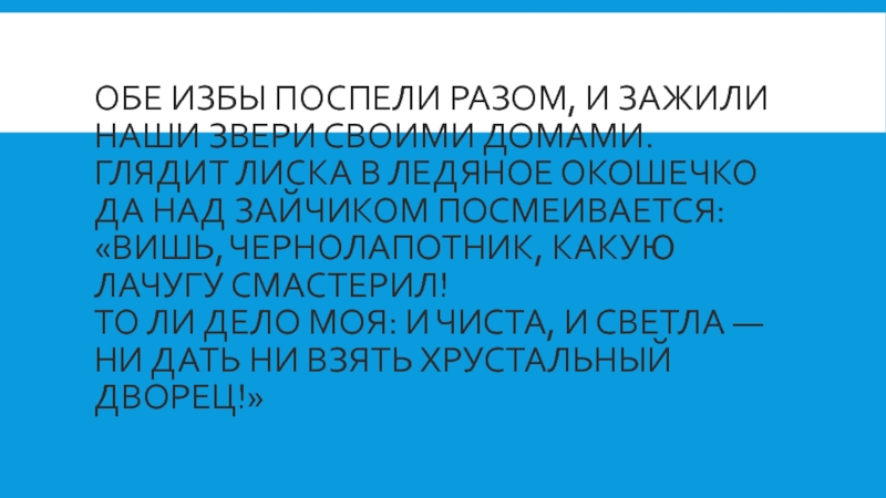 Слайд 6Обе избы поспели разом, и зажили наши звери своими домами.