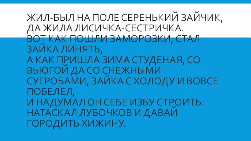 Слайд 2Жил-был на поле серенький Зайчик, да жила Лисичка-сестричка.