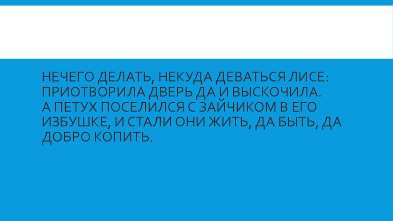 Слайд 19Нечего делать, некуда деваться Лисе: приотворила дверь да и выскочила.