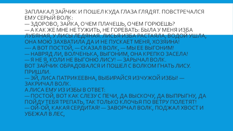 Слайд 10Заплакал Зайчик и пошел куда глаза глядят. Повстречался ему серый Волк: