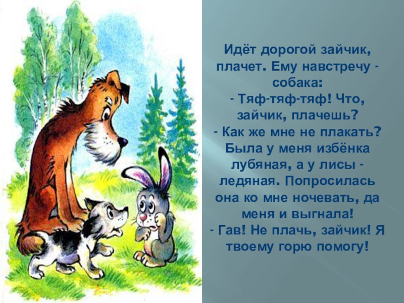 Идёт дорогой зайчик, плачет. Ему навстречу - собака:
