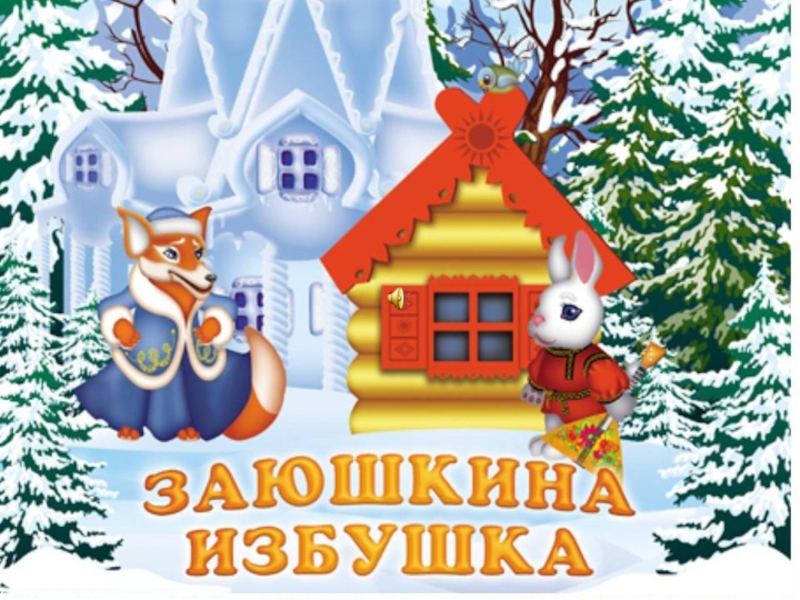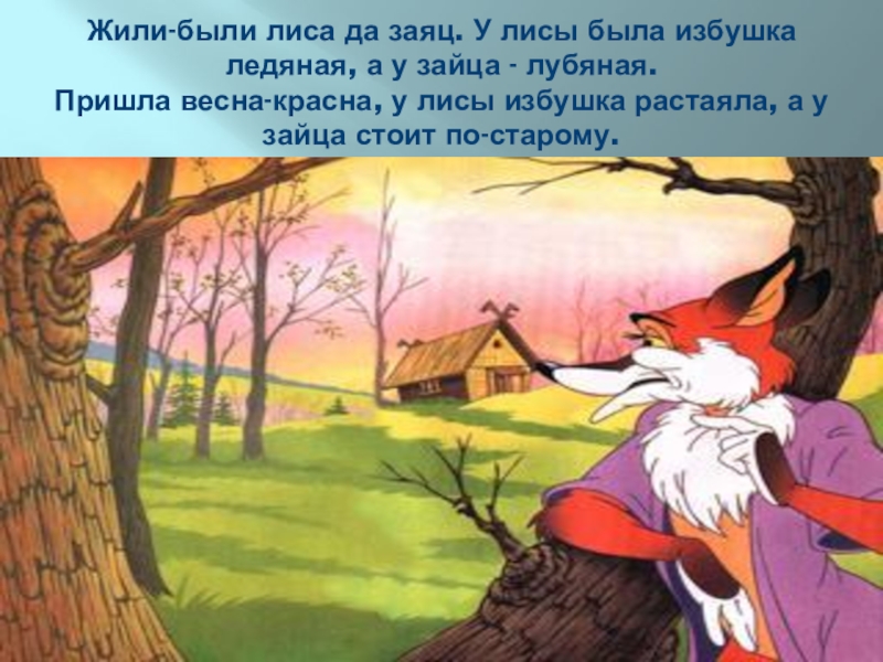 Слайд 13Жили-были лиса да заяц. У лисы была избушка ледяная, а у