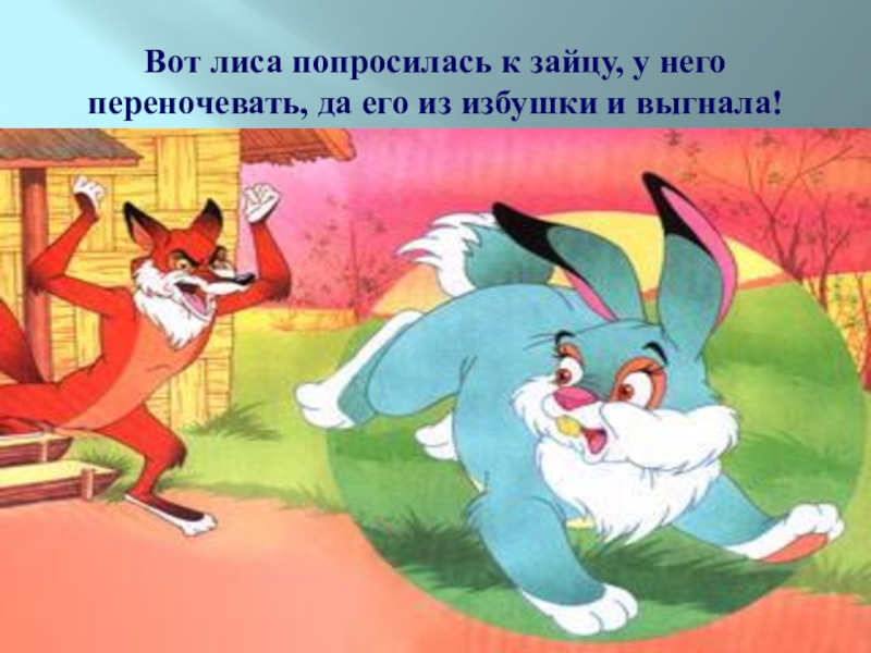 Слайд 14Вот лиса попросилась к зайцу, у него переночевать, да его из