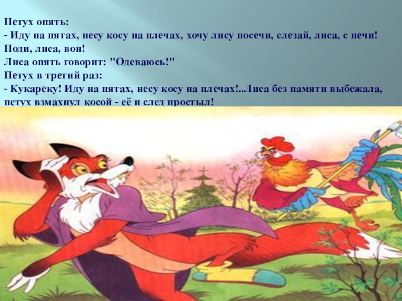 - Кукареку! Иду на пятах, несу косу на плечах!..Лиса без памяти выбежала, петух взмахнул косой - её и след простыл!