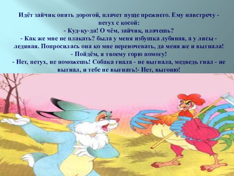 Идёт зайчик опять дорогой, плачет пуще прежнего. Ему навстречу - петух