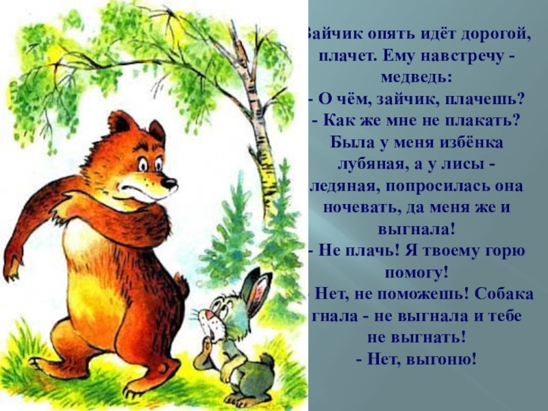 Зайчик опять идёт дорогой, плачет. Ему навстречу - медведь: