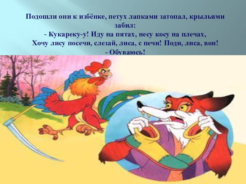 Слайд 20Подошли они к избёнке, петух лапками затопал, крыльями забил: