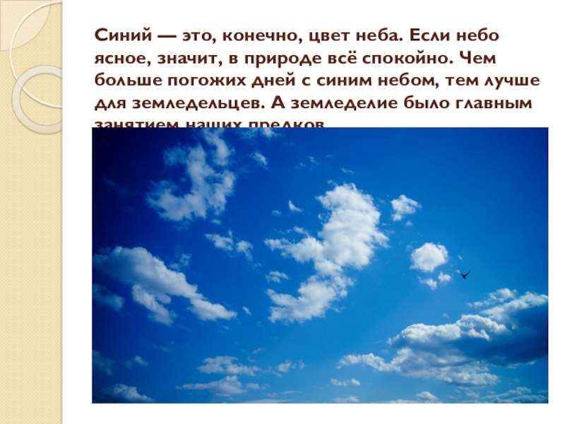 Слайд 10Синий — это, конечно, цвет неба. Если небо ясное, значит, в