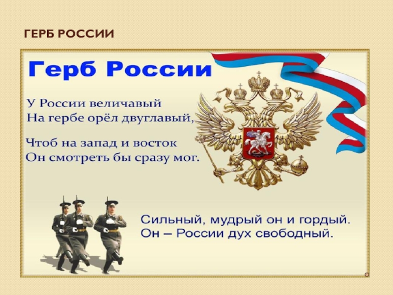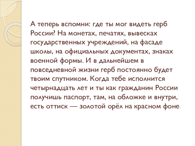 печатях, вывесках государственных учреждений, на фасаде школы, на официальных документах, знаках военной формы. И в дальнейшем в повседневной жизни герб постоянно будет твоим спутником. Когда тебе исполнится четырнадцать лет и ты как гражданин России получишь паспорт, там, на обложке и внутри, есть оттиск — золотой орёл на красном фоне.