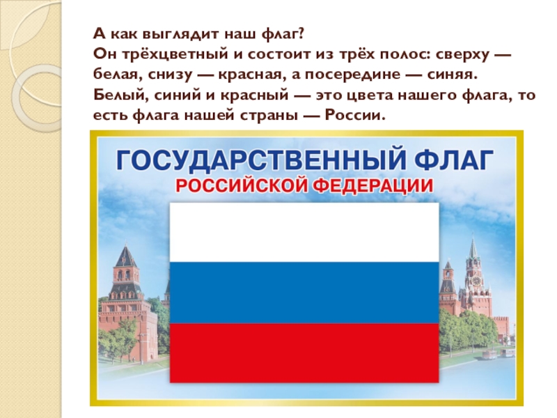 Слайд 8А как выглядит наш флаг? Он трёхцветный и состоит из трёх полос: