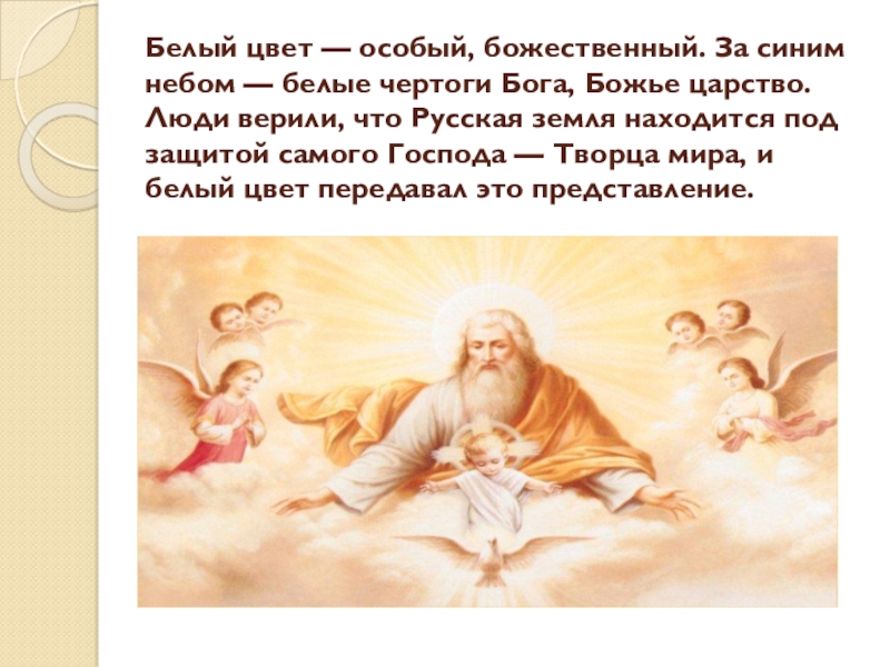 Слайд 9Белый цвет — особый, божественный. За синим небом — белые чертоги