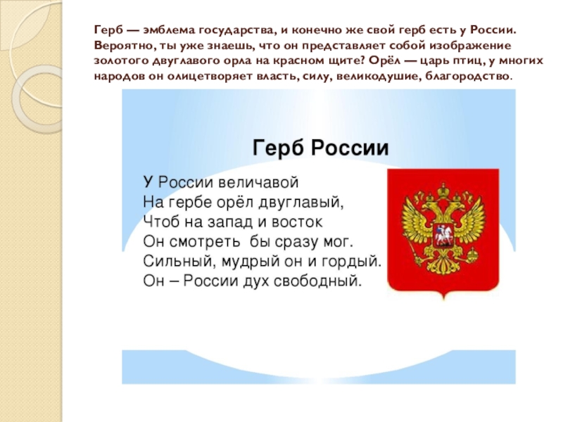 России. Вероятно, ты уже знаешь, что он представляет собой изображение золотого двуглавого орла на красном щите? Орёл — царь птиц, у многих народов он олицетворяет власть, силу, великодушие, благородство.