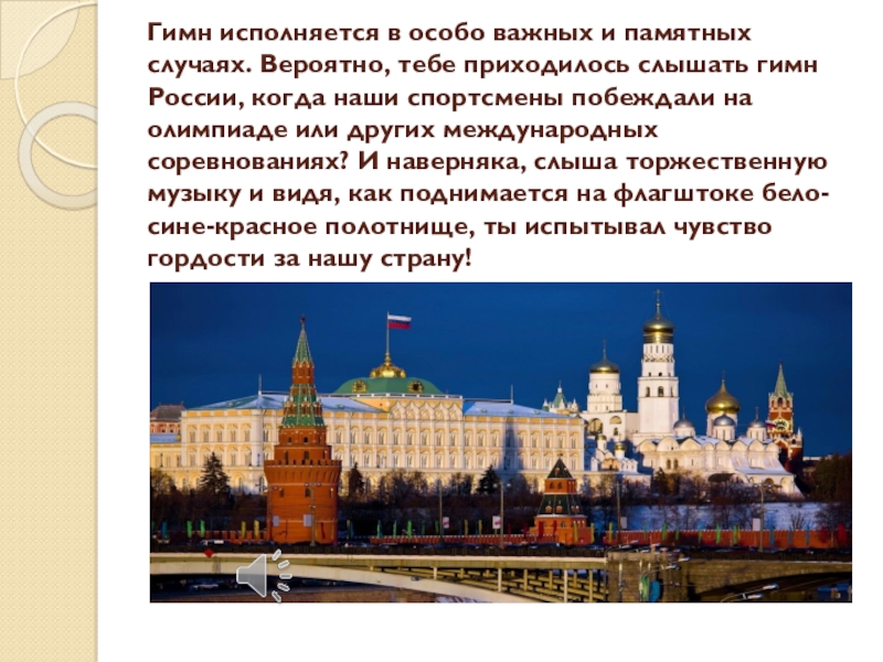Гимн исполняется в особо важных и памятных случаях. Вероятно, тебе приходилось слышать гимн России, когда наши спортсмены