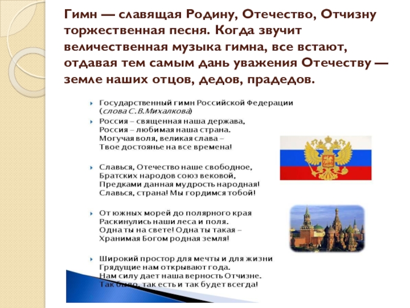 Гимн — славящая Родину, Отечество, Отчизну торжественная песня. Когда звучит величественная музыка гимна, все встают, отдавая тем