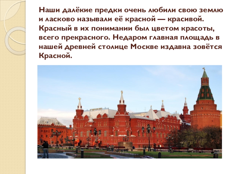 красной — красивой. Красный в их понимании был цветом красоты, всего прекрасного. Недаром главная площадь в нашей древней столице Москве издавна зовётся Красной.