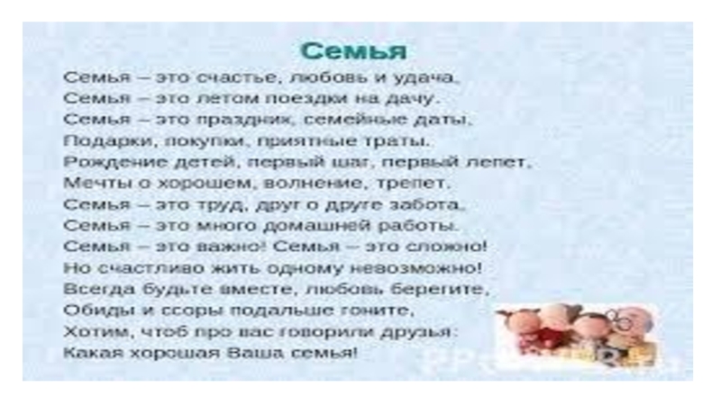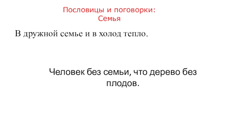 Пословицы и поговорки: СемьяВ дружной семье и в холод тепло.Человек без семьи, что дерево без плодов.