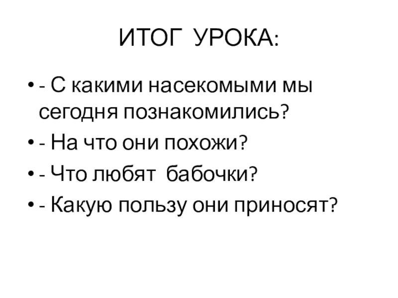 ИТОГ УРОКА:- С какими насекомыми мы сегодня познакомились?- На что они похожи?- Что любят бабочки?- Какую пользу
