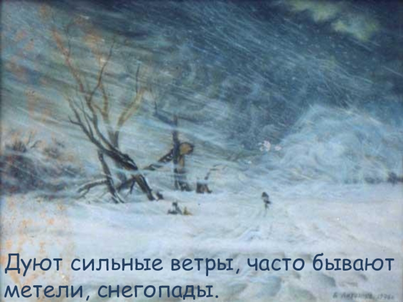 Слайд 5 Дуют сильные ветры, часто бывают метели, снегопады.
