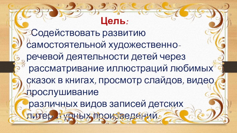 Цель: Содействовать развитию самостоятельной художественно-речевой деятельности детей через рассматривание иллюстраций любимых сказок в книгах, просмотр слайдов, видео, прослушивание различных