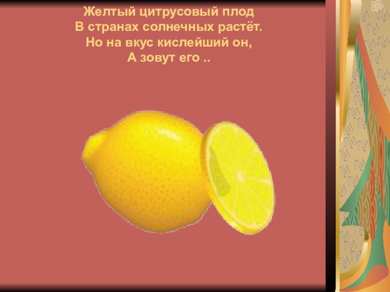 Слайд 11Желтый цитрусовый плод  В странах солнечных растёт.  Но на вкус кислейший он,  А зовут