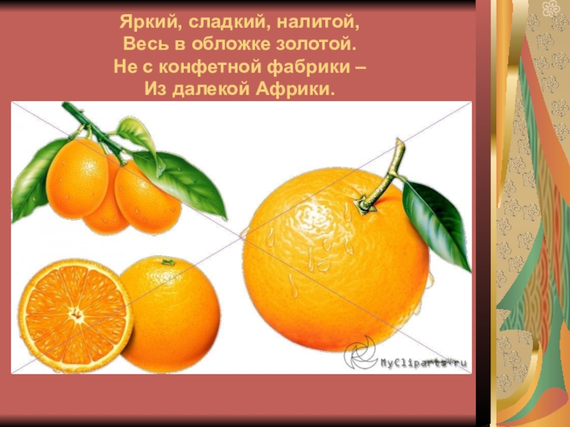 Слайд 10Яркий, сладкий, налитой,  Весь в обложке золотой.  Не с конфетной фабрики –  Из далекой