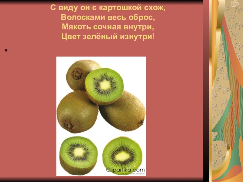 Слайд 14С виду он с картошкой схож, Волосками весь оброс, Мякоть сочная внутри, Цвет зелёный изнутри!