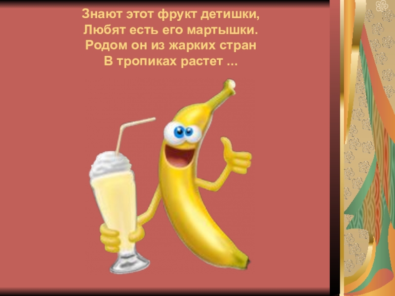 Слайд 9 Знают этот фрукт детишки,  Любят есть его мартышки.  Родом он из жарких стран  В
