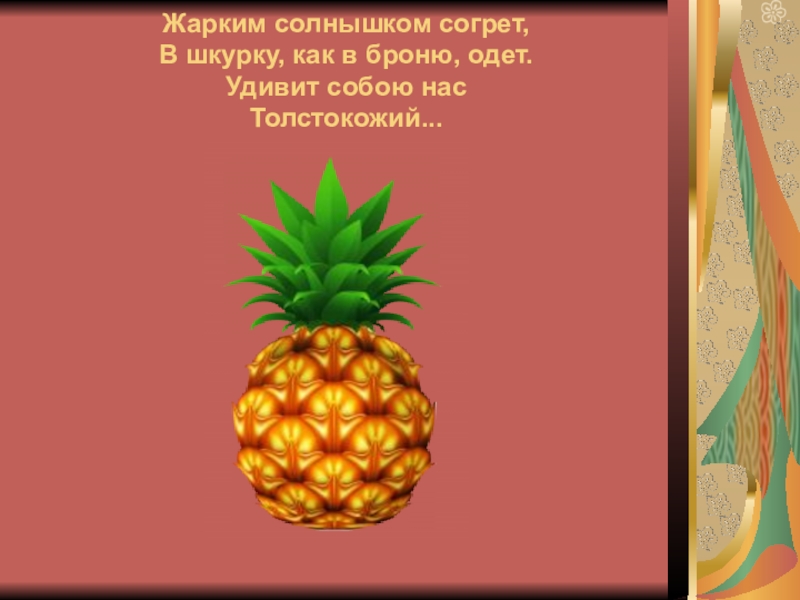 Слайд 13Жарким солнышком согрет, В шкурку, как в броню, одет. Удивит собою нас Толстокожий...