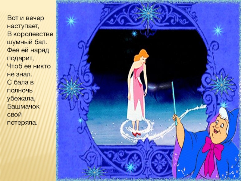 Слайд 8Вот и вечер наступает, В королевстве шумный бал. Фея ей наряд подарит, Чтоб ее
