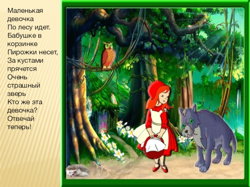 Маленькая девочка По лесу идет. Бабушке в корзинке Пирожки несет, За кустами прячется Очень страшный зверь Кто