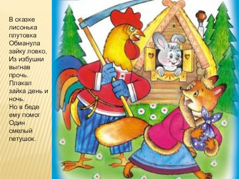 Слайд 9В сказке лисонька плутовка Обманула зайку ловко, Из избушки выгнав прочь. Плакал зайка день