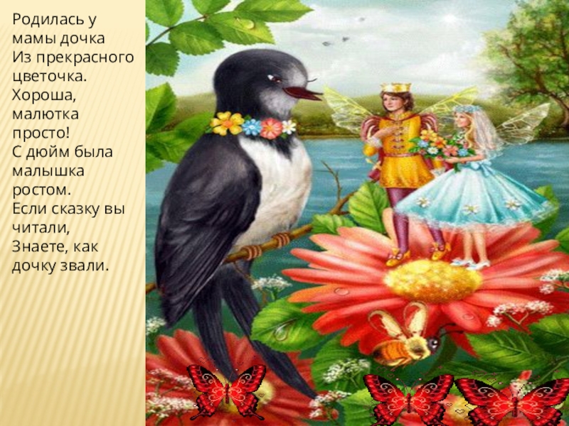 Родилась у мамы дочка Из прекрасного цветочка. Хороша, малютка просто! С дюйм была малышка ростом. Если сказку