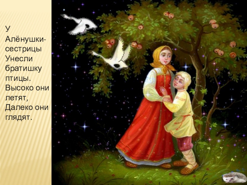 У Алёнушки-сестрицы Унесли братишку птицы. Высоко они летят, Далеко они глядят.