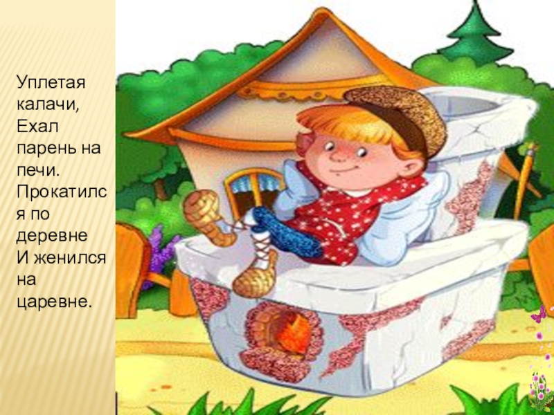 Слайд 6Уплетая калачи, Ехал парень на печи. Прокатился по деревне И женился на царевне.