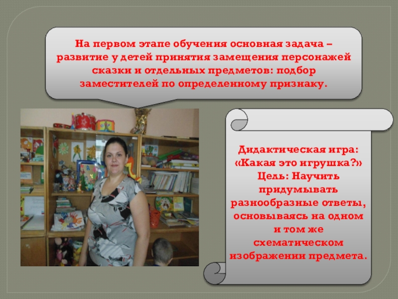 1.Введение «опредмечивающего» образа на материале овладения действиями замещения (младшая группа);