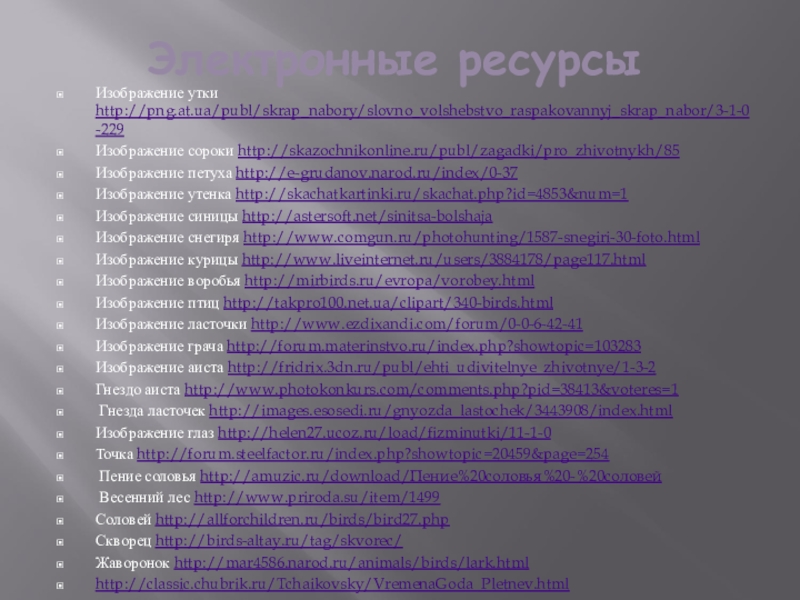 Электронные ресурсыИзображение утки http://png.at.ua/publ/skrap_nabory/slovno_volshebstvo_raspakovannyj_skrap_nabor/3-1-0-229Изображение сороки http://skazochnikonline.ru/publ/zagadki/pro_zhivotnykh/85Изображение петуха http://e-grudanov.narod.ru/index/0-37Изображение утенка http://skachatkartinki.ru/skachat.php?id=4853&num=1Изображение синицы http://astersoft.net/sinitsa-bolshajaИзображение снегиря http://www.comgun.ru/photohunting/1587-snegiri-30-foto.htmlИзображение курицы http://www.liveinternet.ru/users/3884178/page117.htmlИзображение воробья