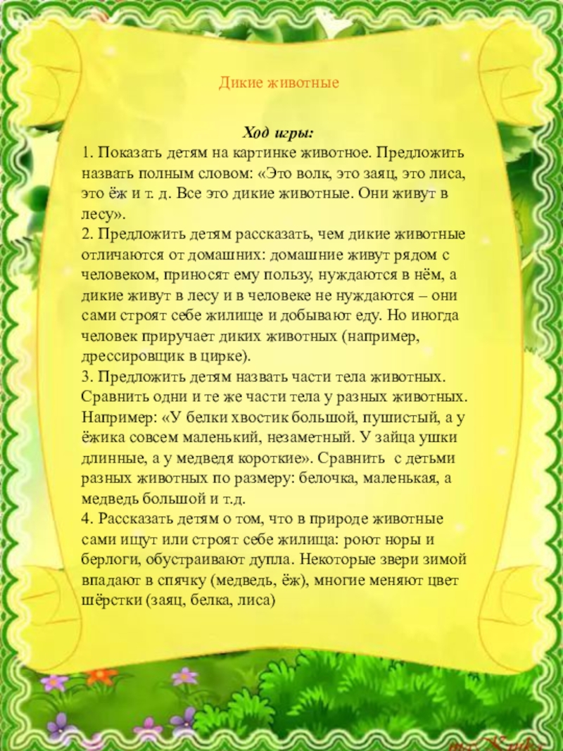 словом: «Это волк, это заяц, это лиса, это ёж и т. д. Все это дикие животные. Они живут в лесу».