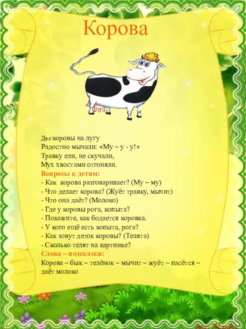 Корова – бык – телёнок – мычит – жуёт – пасётся – даёт молоко