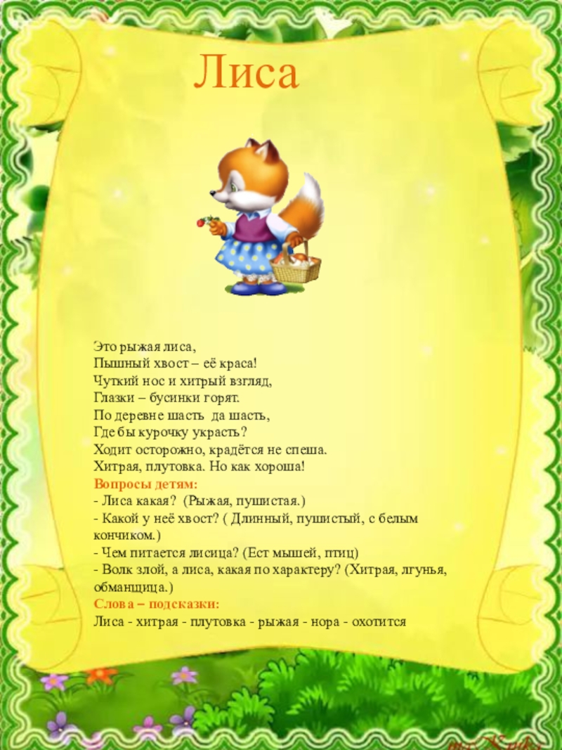 - Волк злой, а лиса, какая по характеру? (Хитрая, лгунья, обманщица.)