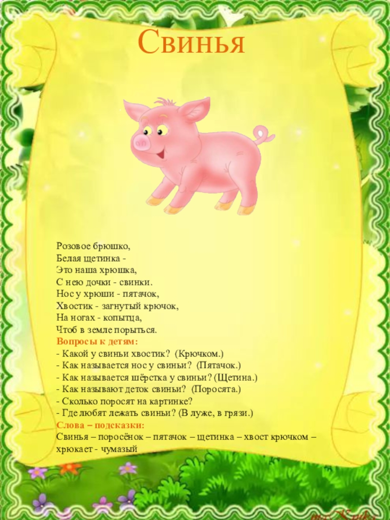 2.Предложить назвать и показать на картинке части тела каждого животного. Рассмотреть, какой у каждого животного хвост, какая шёрстка, уши, есть ли копыта, рожки.
