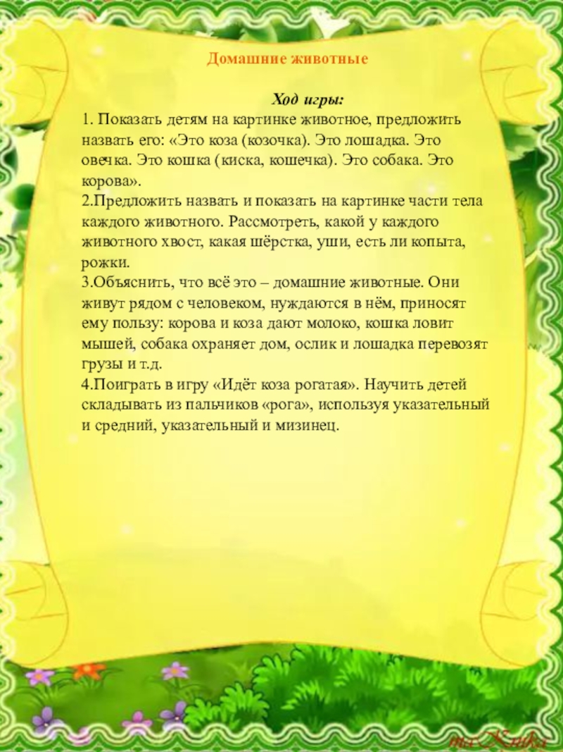 4.Поиграть в игру «Идёт коза рогатая». Научить детей складывать из пальчиков «рога», используя указательный и средний, указательный и мизинец.