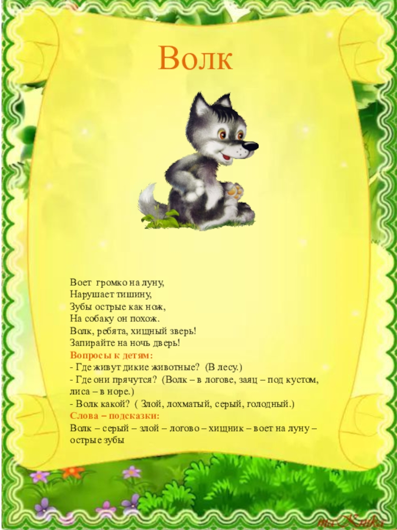 - Волк какой? ( Злой, лохматый, серый, голодный.)
